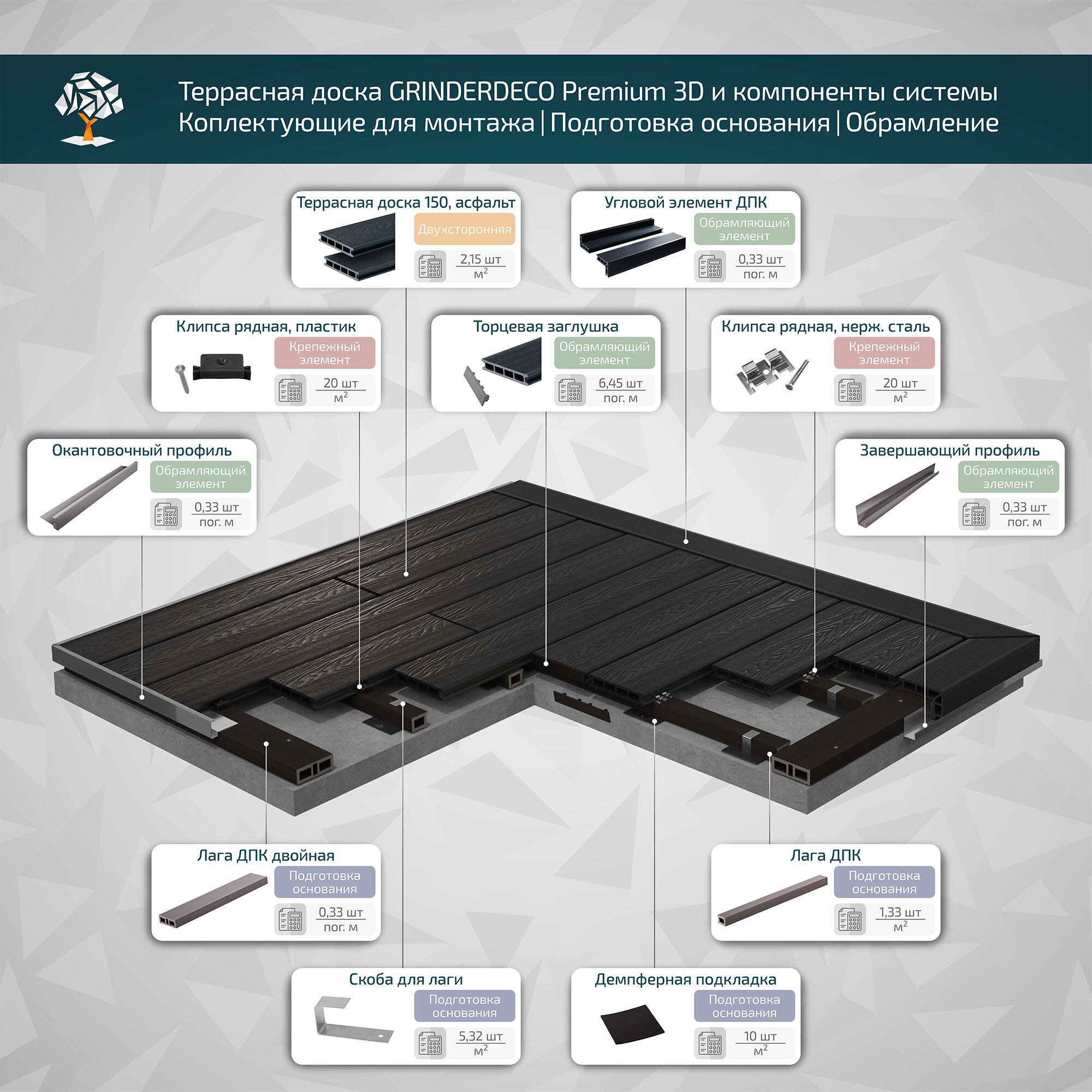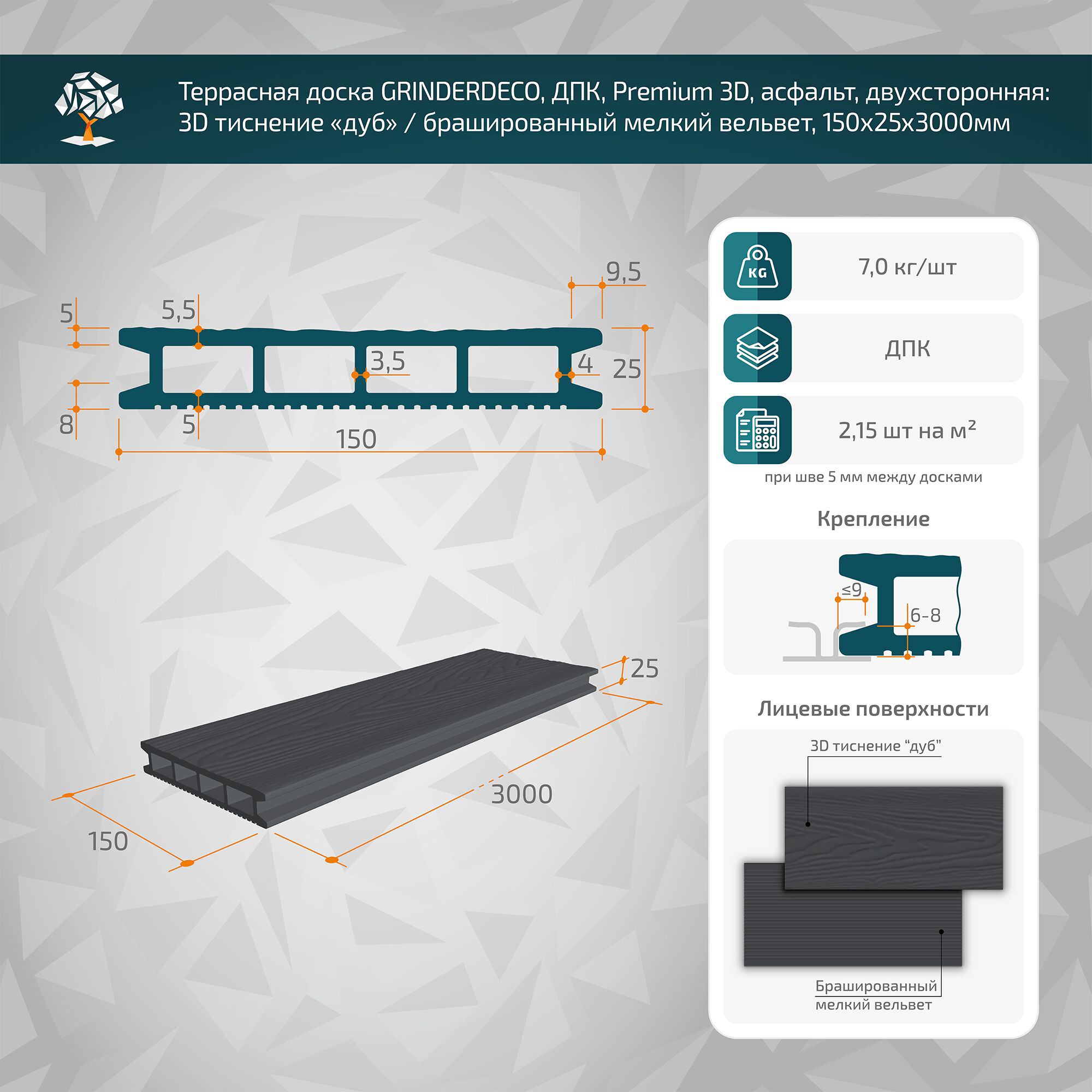 Террасная доска GRINDERDECO, ДПК, асфальт, 3D тиснение дуб , 150х25х3000мм
