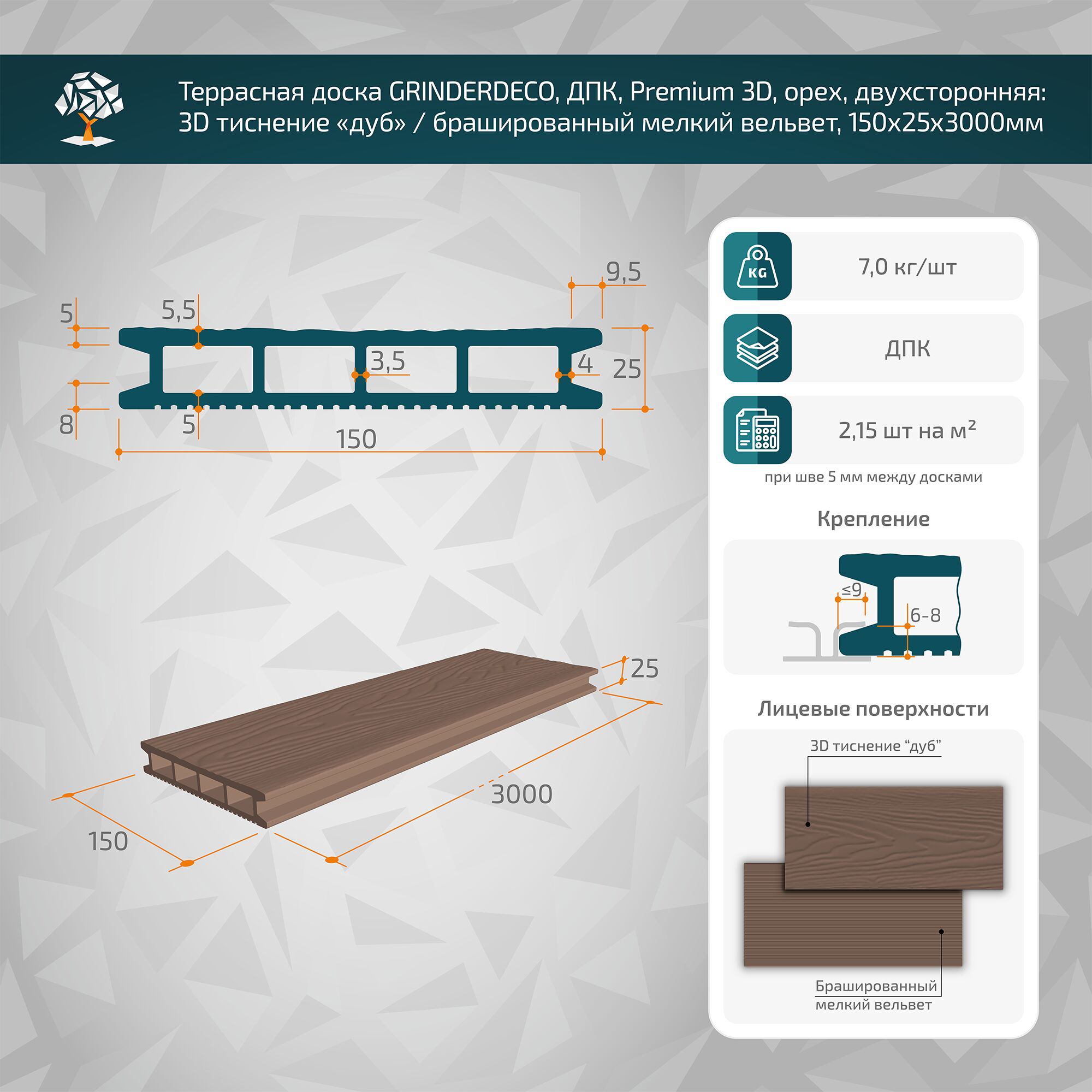 Наша команда оперативно сообщит Вам о снижении цены на Террасная доска GRINDERDECO, ДПК, орех, брашированный мелкий вельвет, 150х25х3000мм в ближайшее время.