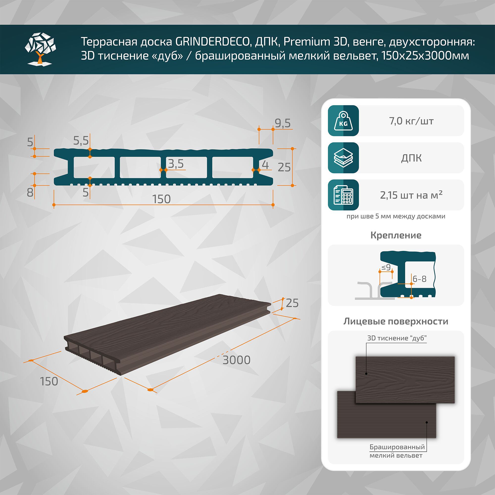 Террасная доска GRINDERDECO, ДПК, венге, 3D тиснение дуб , 150х25х3000мм